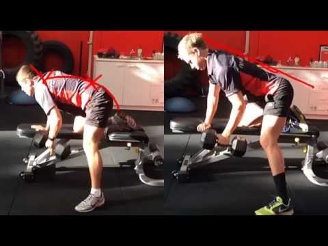 When you row, either with a dumbbell or standing with a barbell for that matter, you must be able to stick your chest out and get into thoracic extension. If you cannot, then by virtue of the fact that your spine is one continuous unit, will find that your lumbar spine has a harder time getting into the proper position which can leave you at risk for a lower back strain.